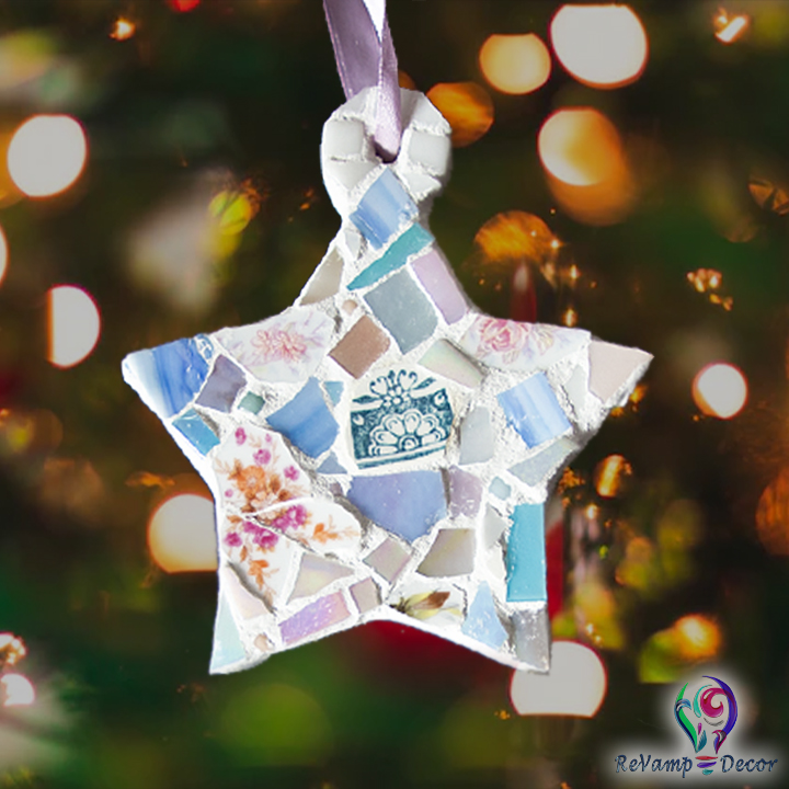 Handmade glass mosaic Christmas ornaments crafted from recycled glass with unique, colorful patterns.