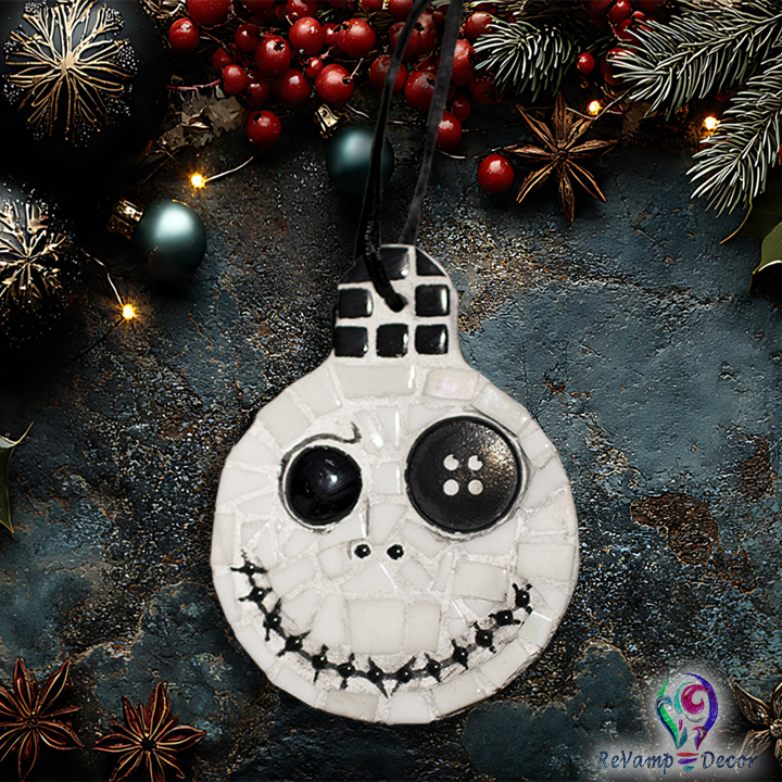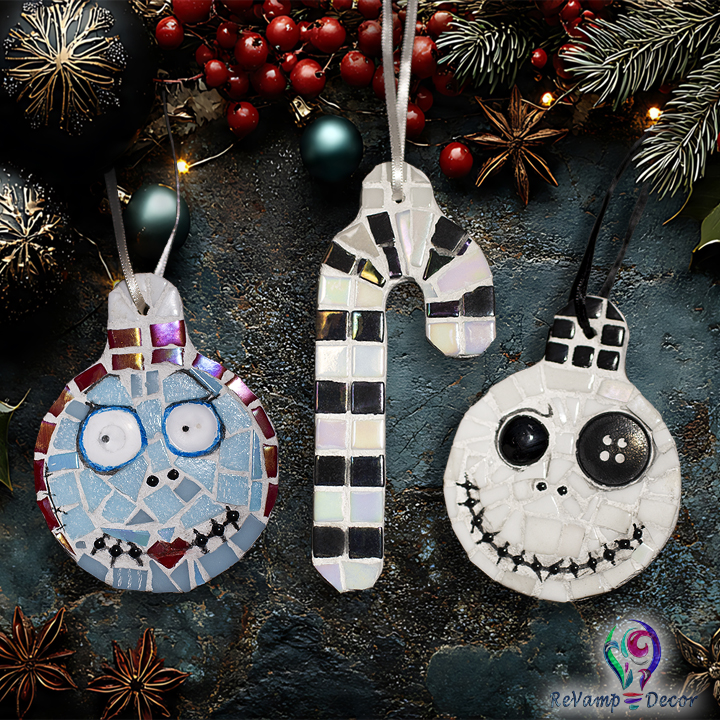 Ez a háromdarabos, kézzel készült mozaik dísz szett egy különleges, kissé sötétebb hangulatú mesevilágot idéz meg, ahol a karácsony és a misztikum találkozik. Az alkotások nem konkrét történetet vagy szereplőt ábrázolnak, hanem egy jól felismerhető vizuális hangulatot és karaktertípust ragadnak meg.