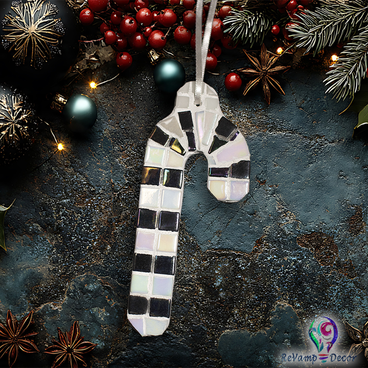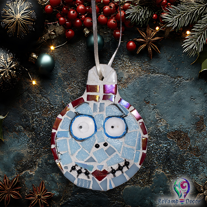 Kézzel készült üvegmozaik karácsonyfadíszek újrahasznosított üvegből, egyedi, színes mintákkal.